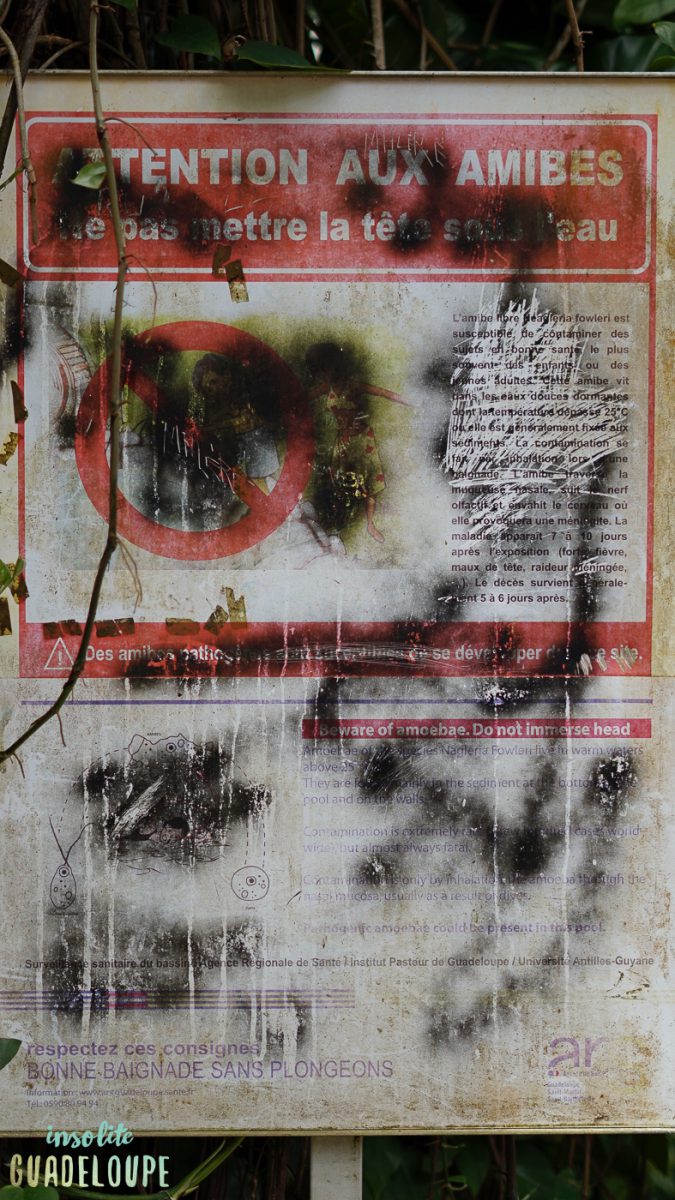 Le danger dans ces eaux chaudes c’est le développement des amibes, des micros organismes qui se développent dans des eaux stagnantes entre 25 et 35 degrés, si vous mettez la tête sous l’eau, ils peuvent s’infiltrer via les muqueuses, surtout chez les enfants et les jeunes adultes, mais pas de panique cela reste très rare (100 cas dans le monde chaque année). Les premiers symptômes sont de fortes migraines et si cela vous arrive, mieux vaut consulter rapidement car les amibes peuvent être mortelles. On vous invite donc à bien respecter les recommandations des panneaux et à ne surtout pas mettre la tête sous l’eau.